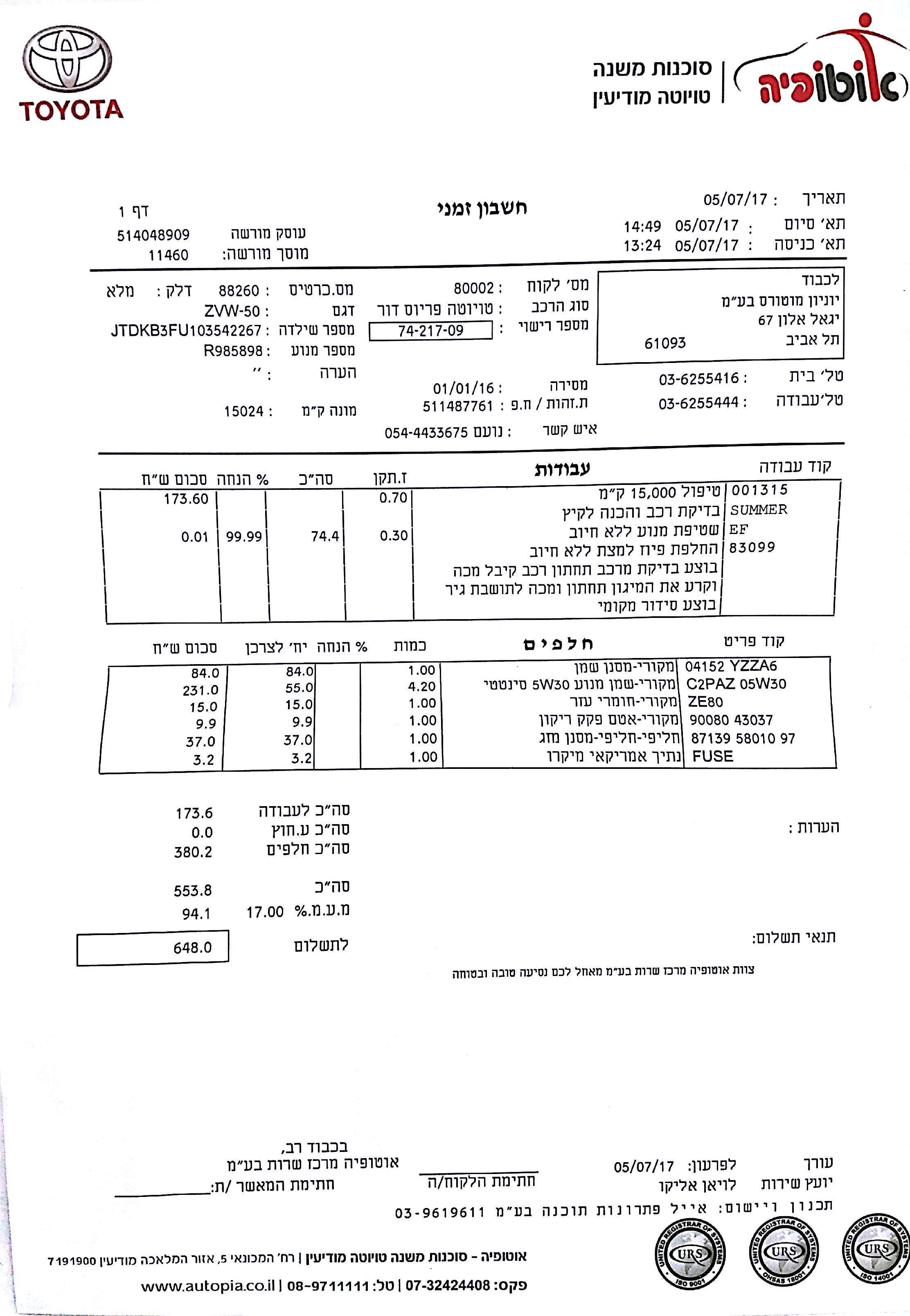 5/7/2017, 16:14 היום בצהריים נכנסו לטיפול 15,000 במרכז השירות של סוכנות "אוטופיה" במודיעין, כשעל הצג יש 15,024 קילומטרים בדיוק. הטיפול נקבע לשעה 13:00, והגענו באיחור של כ-10 דקות. נציג שחיכה לנו קיבל אותנו מיד, והתחיל לקחת את הפרטים: מספר הרכב, הקודן (אין), הדרישות מהטיפול, תקלות נוספות אם ישנן וכתובת מייל למשלוח משוב. הוא יצא איתנו לרכב ורשם את הקילומטראז', כמות הדלק ובדק אם יש פגיעות מסביב לרכב - כדי להימנע מטענות עתידיות.