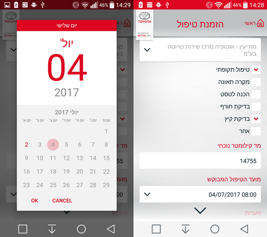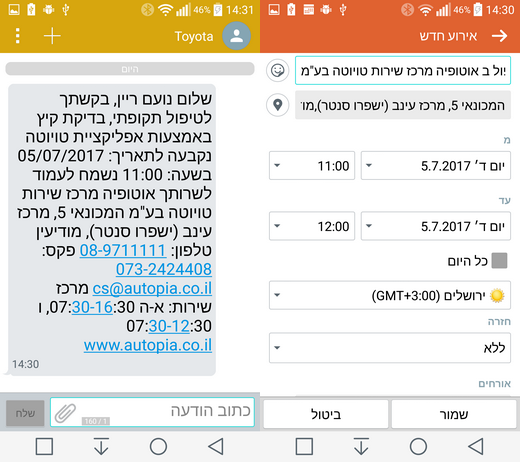 2/7/2017, 14:37 הקילומטרים נצברים, ומועד הטיפול מתקרב בצעדי ענק. הבוקר החלטנו לקבוע תור למוסך - באמצעות האפליקציה של טויוטה. האפליקציה מאפשרת לבחור את מרכז השירות הרצוי, לסמן איזה טיפול מבוקש ולבחור מועד. אנחנו לא בטוחים שהיא מסונכרנת עם הלו"ז של המוסכים השונים, כי בכולם היא לא נתנה לבחור טיפול למחר - ולא הגבילה כל שעה אחרת בימים אחרים. אבל מצד שני, כשהתקשרנו למוסך לוודא, אמרו שמחר אכן הכל מלא. תוך פחות מדקה קבענו את התור, קיבלנו SMS עם פרטי ההזמנה וגם הצעה לשמור את הטיפול ביומן של הסלולארי. תוך זמן קצר גם התקשרו אלינו מהמוסך כדי לוודא את הפרטים - קצת מיותר לדעתנו, כי אם כבר עושים הכל דרך האפליקציה - אז לשם מה נדרשת שיחת טלפון נוספת?