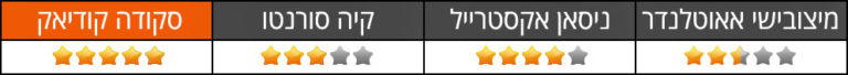 מנוע וביצועיםאף אחת לא זכתה ב-5 כוכבים בסעיף הזה, וגם הארבעה ניתנו כאן בחסד. מי שמעוניין במנוע חזק יצטרך להכניס את היד עמוק לכיס ולבחור באחת הגרסאות החזקות יותר של הארבעה. לקודיאק מנוע טורבו יעיל, שהפך אותו לרכב הזריז במבחן על אף שאיננו מהיר מאוד בפני עצמו. הניסאן גמיש, בשרני וחסכוני, אם כי לא ביצועיסט. לאאוטלנדר יש תגובת דוושה טובה אך מחסור במומנט, והסורנטו לא מנצל היטב את הנפח הגדול וגם סובל ממשקל גבוה שפוגע בביצועים.