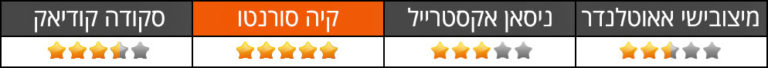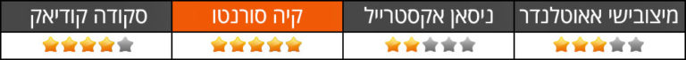 אבזור ותפעולאבל בגלל שהסורנטו מגיע מקטגוריה גבוהה ויקרה יותר, בקיה התאמצו וחתכו באבזור כדי להכניס אותו לטווח המחירים שמתחת ל-200,000 שקל. במפרט הרשמי אין מערכת מולטימדיה, אך לקוחות פרטיים שירכשו את הסורנטו יקבלו מערכת כזו בהתקנה מקומית (וכך גם בחלק מציי הרכב). עוד מציע הסורנטו בקרת שיוט, מחשב דרך מפורט, קיפול חשמלי למראות, חיישני חניה היקפיים ובקרת אקלים מצוינת הכוללת יחידת מיזוג נפרדת לשורה השלישית, עם כפתורי שליטה בשורה הזו! ללא ספק מדובר בנוק אאוט בתחום המיזוג במבחן הזה.